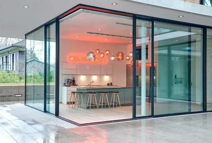 A combination of strong profiles, stainless steel rails, & polyamide rollers with needle bearings gives the strength for our large panel sliding doors.