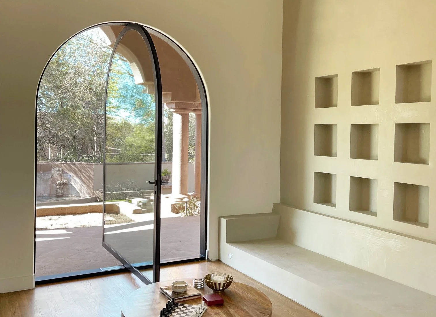 As a singular door, series of openings, or arched exterior connection, pivot doors are truly functional art pieces. Swings can be set at 180 degrees or 360 degrees. The pivot hinge system is designed in such a way that while the door is heavy and secure, opening it feels light as a feather.